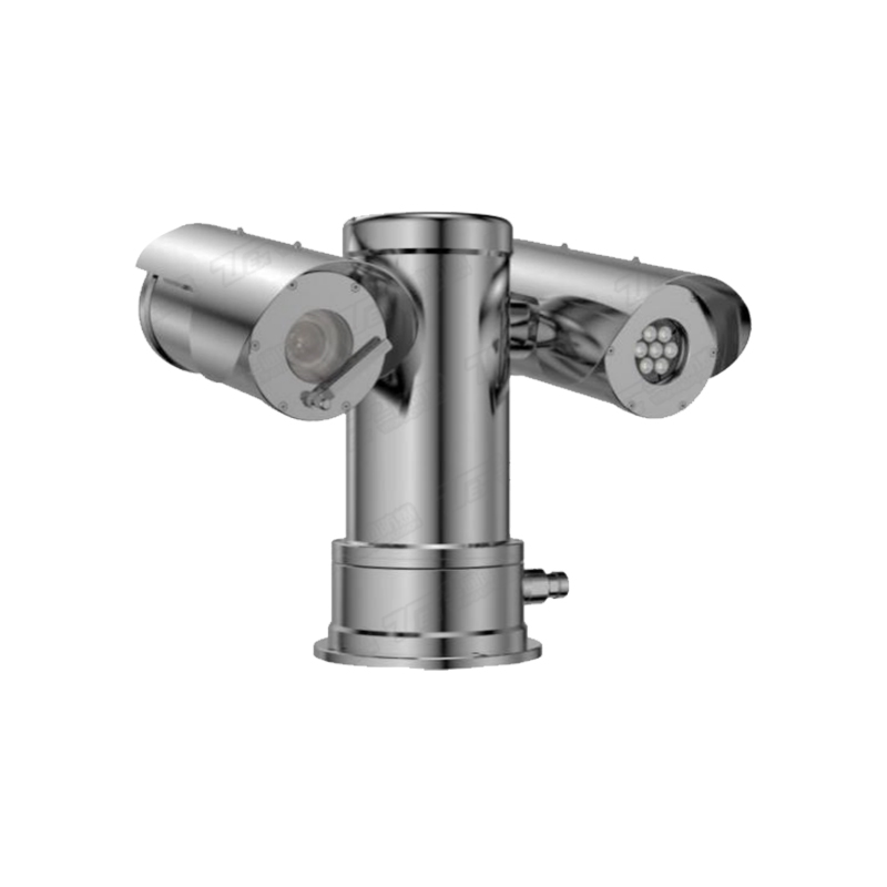 不锈钢护罩可防止任何内部火花或爆炸溢出和点燃周围空气中的气体或灰尘,从漆黑直至炫目光亮环境中,此款热成像摄像机都可精确侦测和迅速核实各种事件并做出反应,该款网络摄像机可与其他设备(如门禁和火灾警报)高度集成; 机体采用一体化结构设计,云台与摄像仪之间无外连接线缆,云台采用高精密齿轮和步进电机传动方式组合设计,可进行 360°的水平连续旋转和 ±90°的垂直旋转,实现全方位无死角监控,采用双侧载设计,云台重心均匀居中,运转更平稳,即使在最严峻的环境下,摄像机都可确保画面的清晰度和精确度; 能够实现自动扫描、自动巡航、断电记忆等高级功能,预置点定位精确,记忆功能可靠,断电不丢失,随机配置遮阳罩、雨刮器,并且可选自动加热组件和风扇。雨刷器和防护罩完全集成,消除凝结水滴,并不妨碍系统的可视范围,镜头雨刷采用汽车雨刮片,耐候性好,更换方便; 自动加热组件能保证设备在 -40℃~ +60℃温度条件下长时间稳定工作防凝结,镜头视窗采用物理钢化浮法玻璃,表面涂覆纳米涂层,防止粘附灰尘,并配有雨刷,即使在恶劣环境下也能确保画面的清晰流畅; 安装快速方便,所有接线从一体化防爆摄像仪下部接入,调试简便,外形美观大方,性能稳定可靠。 应用场景: